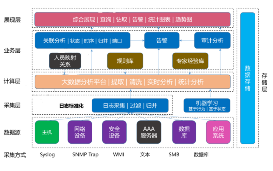 14年项目实践,支持250+品牌,5000+种日志类型:全面支持Syslog、SNMP Trap、HTTP、ODBC/JDBC、WMI、FTP、SFTP、TCP、KAFKA、SMB协议的日志收集;支持阿里云SLS日志的采集;支持使用代理(Agent)方式提取日志收集。可以覆盖主流硬件设备、主机及应用,保障日志信息的全面收集。